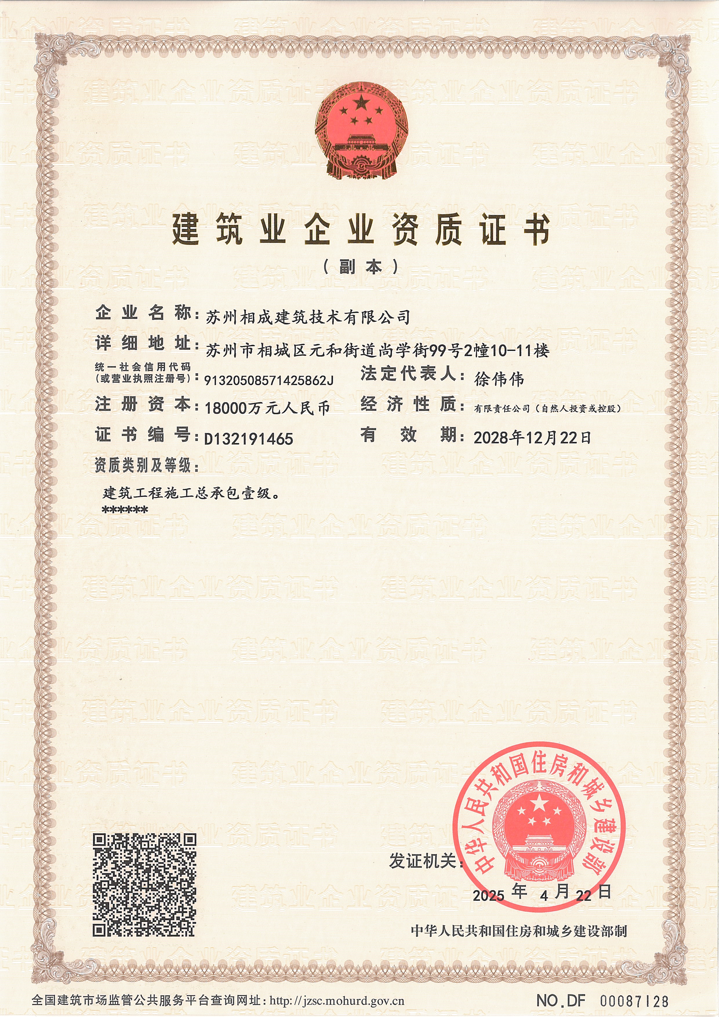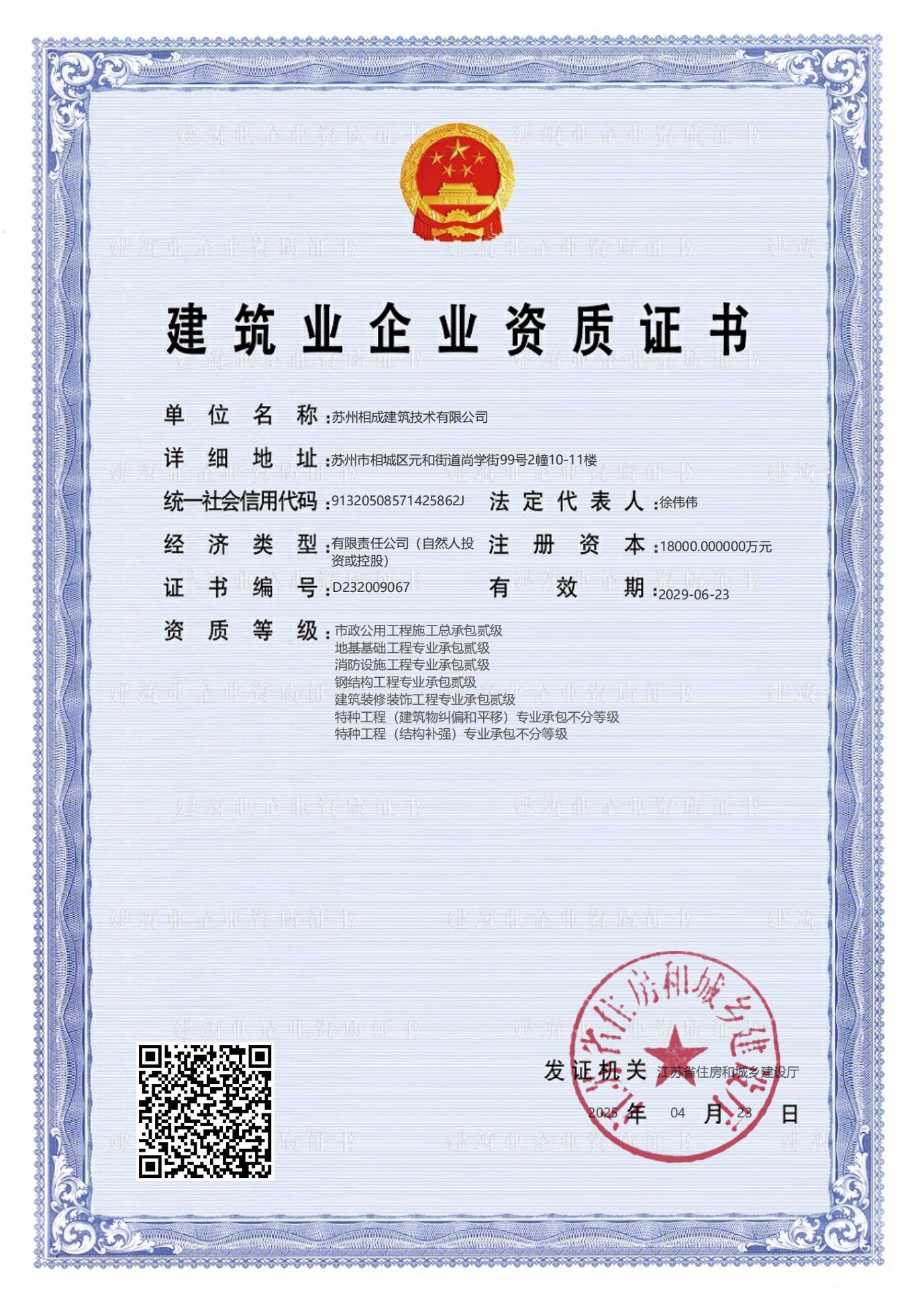 蘇州相成建筑技術(shù)有限公司是一家以提供建筑開發(fā)服務(wù)為主的建筑企業(yè),公司位于蘇州市相城區(qū),成立于2011年3月,注冊資本 10000萬,歷經(jīng)13年的努力于2022年7月獲省住建廳頒發(fā)房屋建筑工程施工總承包壹級資質(zhì),市政公用、建筑裝飾、地基基礎(chǔ)、消防設(shè)施、鋼結(jié)構(gòu)工程等專業(yè)承包二級資質(zhì); 2023 年6月份增設(shè)房屋建筑工程監(jiān)理甲級、市政一級監(jiān)理資質(zhì);目前是相城區(qū)唯一一家集施工總承包一級和建筑工程監(jiān)理甲級資質(zhì)的企業(yè)。